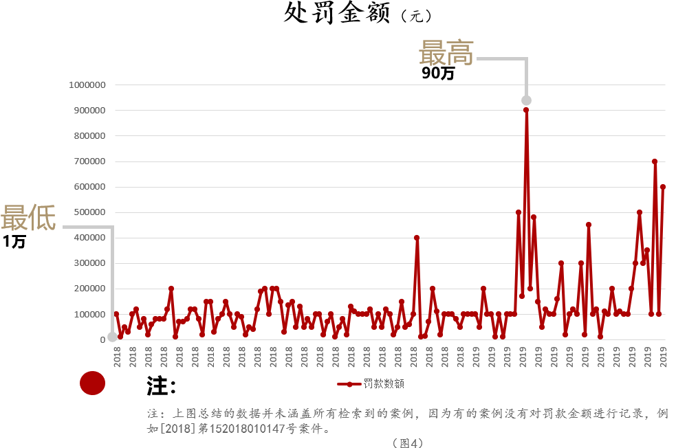 新法在处罚力度上要远大于旧法,除了没收违法所得之外,将原来顶格处罚20万的罚款增长到顶格处罚300万,同时还增加了“吊销营业执照”的处罚。截止2019年12月31日,我们尚未发现吊销营业执照的处罚案例,而罚款数额已经出现了最高90万的案件,相信上百万的案件也会在将来的执法中出现。总体而言,处罚力度是显著加大的。以下是处罚金额的数据图: