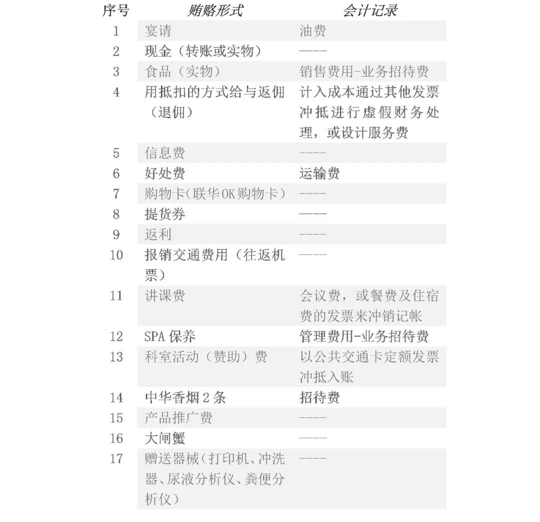 赂的形式多种多样,新法实施后的案件中依然大量出现了此前执法中常见的贿赂形式。无论其形式如何变化,商业贿赂“权钱交易”的内核始终是不变的。而会计记录通常是贿赂的一个外在表征,因为不当支付需要用合法形式进行掩盖以免被发现,但是其并不意味着必然存在商业贿赂。通过案例总结,以下信息供参考(部分列举):
