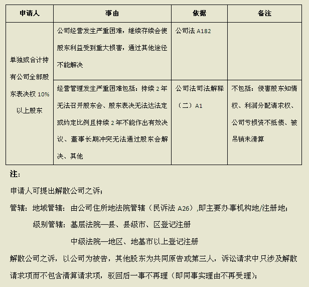 其中,根据作出解散的主体和程序不同,又可以分为:(四)为行政强制解散和(五)为司法强制解散两类;行政强制解散主要是由行政强制行为引发,相对简单,因此,笔者以下重点分析一下司法强制解散,具体如下表: