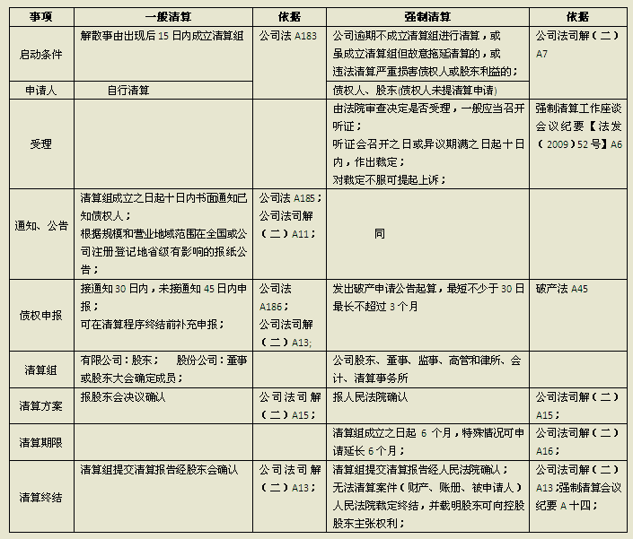 先解释一下什么是公司的清算。一般而言,公司清算是指在公司解散时,为终结公司作为当事人的各种法律关系,使公司的法人资格归于消灭,而对公司未了结的业务、财产及债权债务关系等进行清理、处分的行为和程序。公司清算是基于公司面临终止的情况下发生的。公司终止的原因有两种,一种是公司的解散,另一种是公司的破产,即公司基于宣告破产而终止。这两种情况下都会引起公司的清算,只是清算组织和清算程序存在不同。下面先就公司解散清算进行说明。如前分析,根据清算是否为公司意思自治引发,可以将公司解算清算具体分为一般清算和强制清算,两者具体规定和异同参见下表: