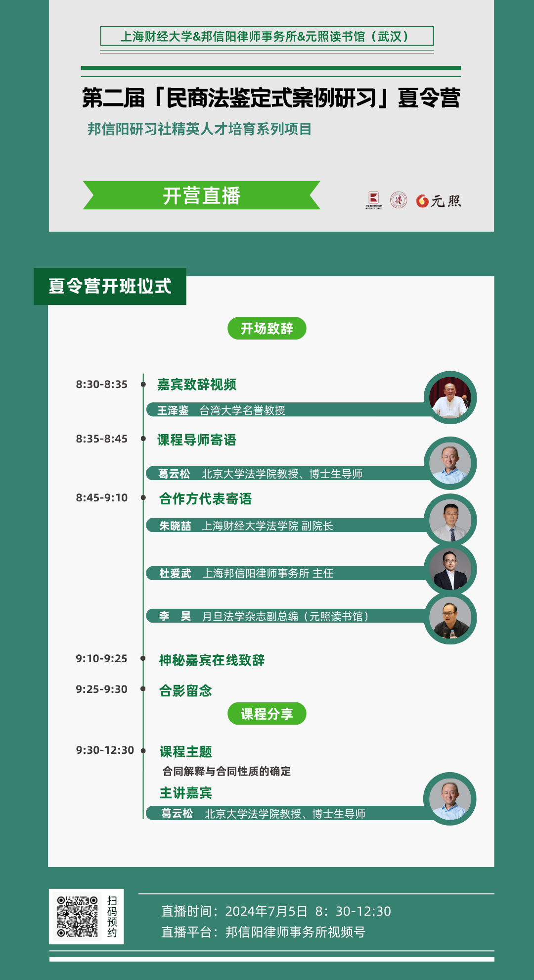 2024年7月5日上午8:30,我们将进行开营仪式,届时仪式将在邦信阳律师事务所视频号全程直播。本次开营特邀台湾大学名誉教授王泽鉴大师作视频寄语,另外还邀请多位大咖进行开营致辞。