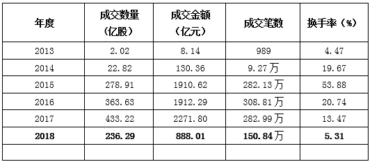 上述数据表明,自2015年到2018年新三板股票交易呈现先上升后回落的过程,2018年的股票交易量已为新三板扩容以后的新低,换手率也极低,交易不活跃。