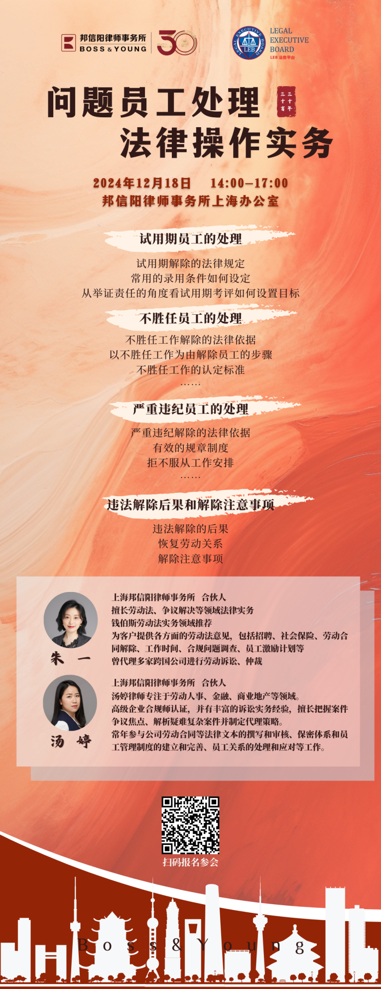 邦信阳律师事务所合伙人朱一律师和汤婷律师,就常见问题员工处理的法律实操问题进行深入的探讨,涉及试用期员工、不胜任员工和严重违纪员工的处理,以期为企业有效的用工管理出谋划策。