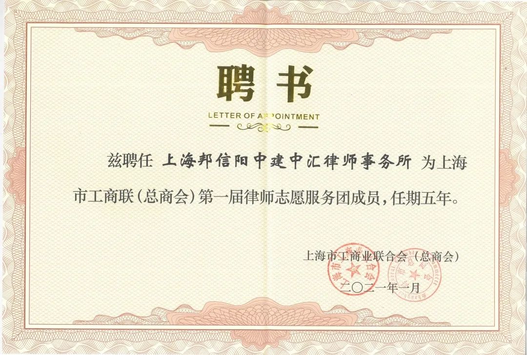 2021年1月,上海市工商业联合会下发通知,成立第一届律师志愿服务团。在上海市工商联(总商会)十四届五次执委会议上,由上海邦信阳中建中汇律师事务所等在内的十二家律师事务所组成的上海市工商联(总商会)第一届律师志愿服务团正式成立。邦信阳中建中汇合伙人陆国飞律师作为邦信阳中建中汇代表全程参与成立仪式及会议。