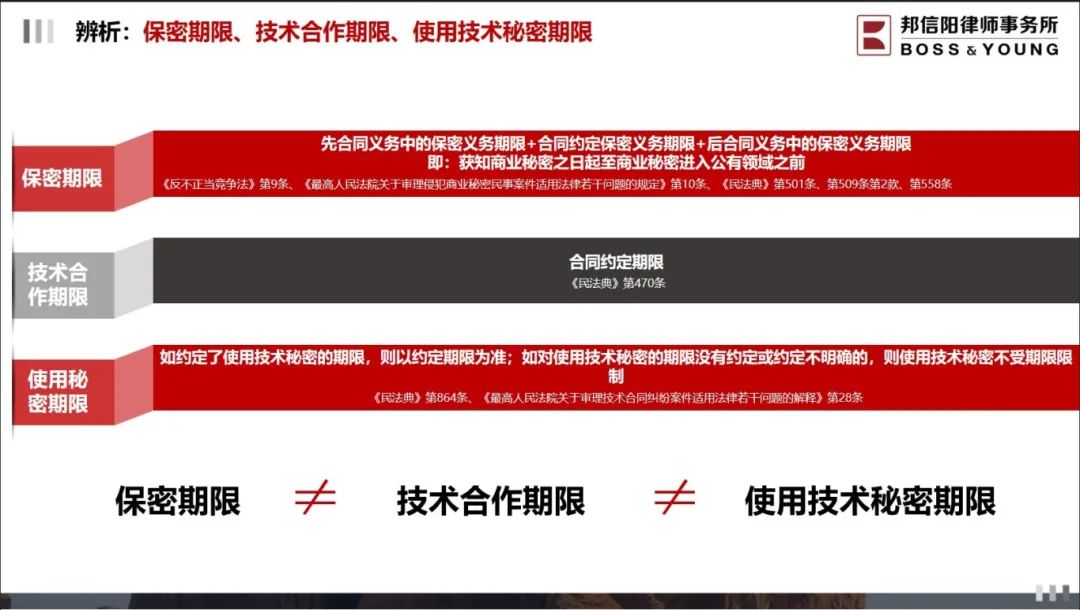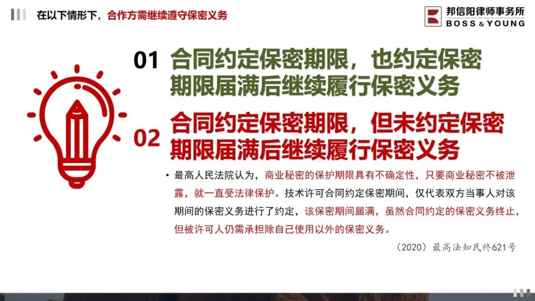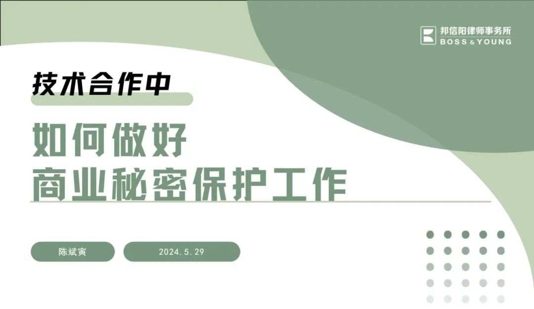 邦信阳律师事务所合伙人陈斌寅律师深耕知识产权领域多年,尤其在商业秘密方面有深入研究。研讨会现场,陈律师围绕商业秘密保护中最为关键的几个问题包括保密期限约定、保密义务遵守条件、已披露技术秘密的合同如何处理等,结合实务案例展开分析。