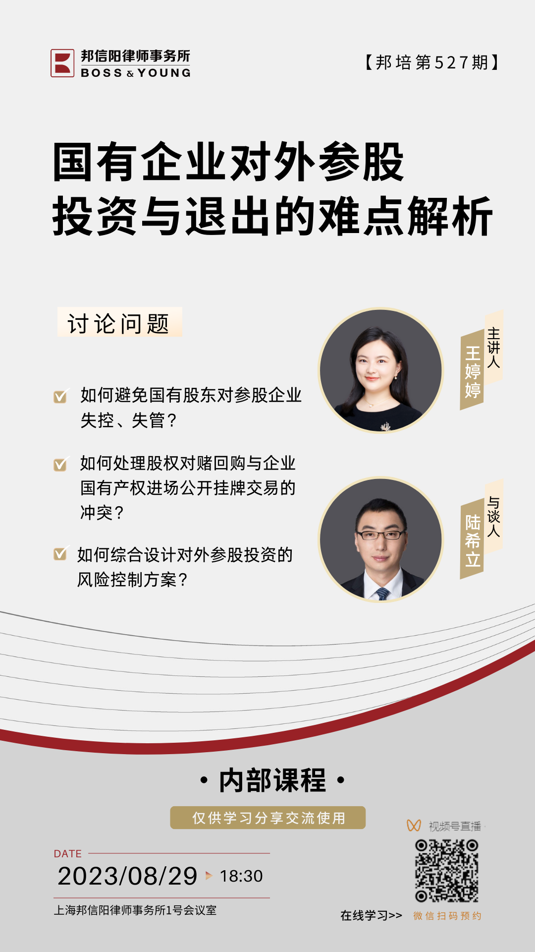 2023年8月29日,上海邦信阳律师事务所“邦培第527期”课程开讲。本期课程由合伙人王婷婷律师主讲,与谈嘉宾为合伙人陆希立律师。