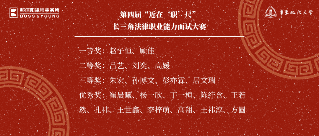 来自不同高校的参赛选手们分为律所赛道与法务赛道,一一通过“自我介绍”、“压力面试”、“法律实操大挑战”等重重考验,充分展现自身缜密的法学思维、扎实的理论功底、优良的抗压能力。最终,大赛双赛道共有20位表现优异的青年学子从中脱颖而出,获奖名单如下: