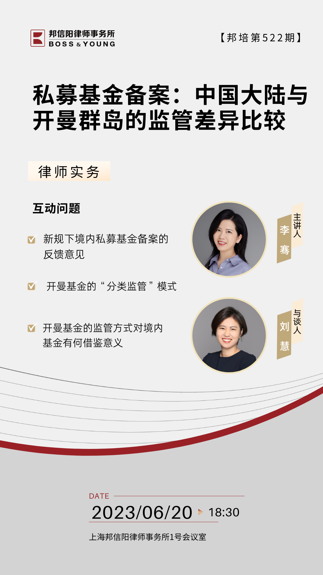 2023年6月20日,上海邦信阳律师事务所“邦培第522期”,由合伙人李骞律师主讲、合伙人刘慧律师与谈,主题为“私募基金备案:中国大陆与开曼群岛的监管差异比较”。本次课程内容由沈越律师整理。