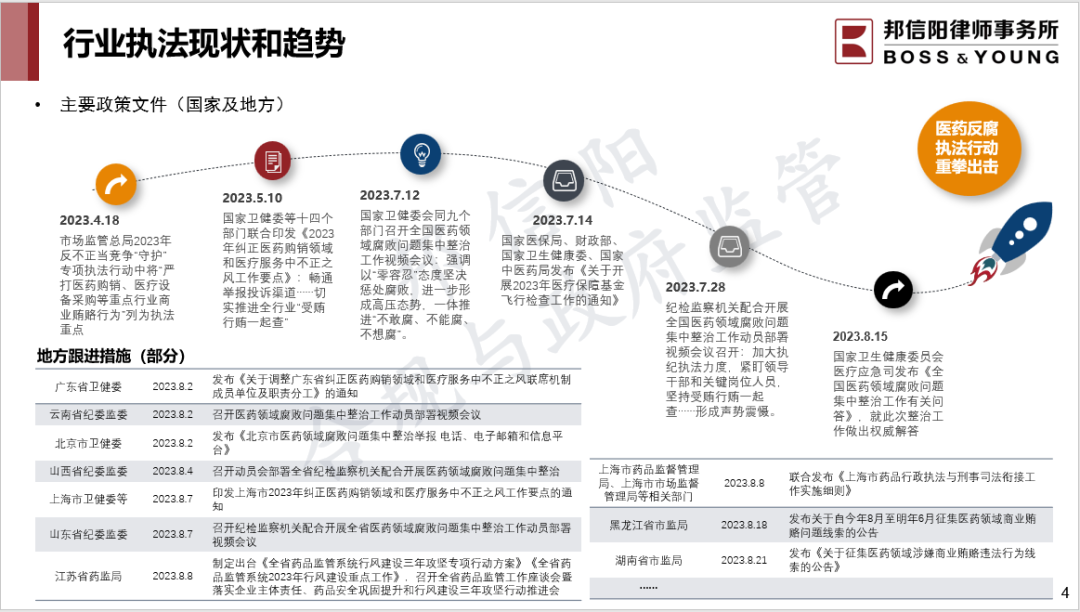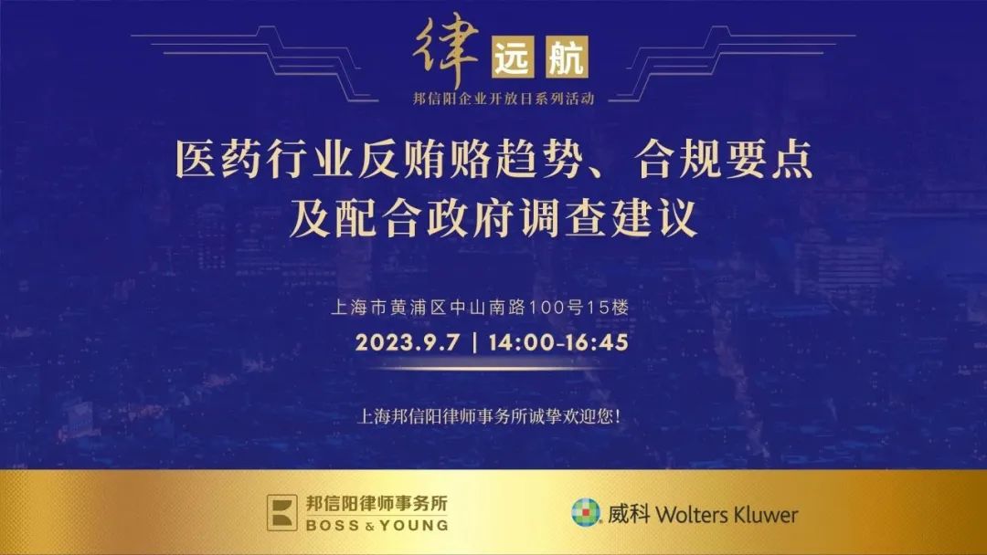 2023年9月7日,邦信阳“律·远航”企业开放日系列活动——“医药行业反贿赂趋势、合规要点及配合政府调查建议”圆满举办,本次活动由上海邦信阳律师事务所与威科先行共同举办,上海邦信阳律师事务所合规与政府监管业务组合伙人张士海律师、合伙人金瑜律师与合伙人杨涛律师进行了精彩深入的分享。本次活动获得了广大医药企业内部法务、合规等专业人士的关注与支持,与会人数众多、讨论活跃,线上线下400余名医药企业法务、合规参加了会议。