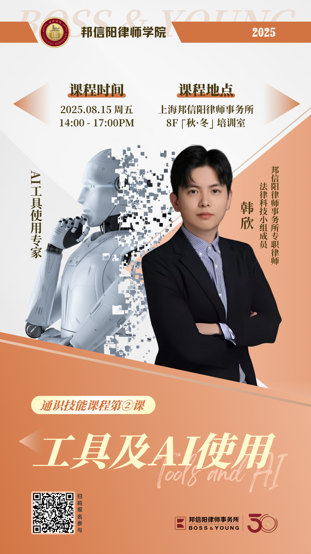 【通识技能课程第②课:工具及AI使用】将于8月15日下午14:00在上海邦信阳律师事务所举行,欢迎报名线下参与。本期课程将由上海邦信阳律师事务所专职律师、法律科技小组成员韩欣及外部AI工具使用专家主讲。