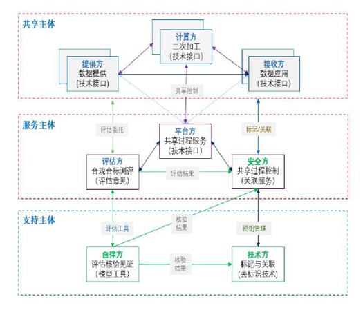 数据共享域中,按机构对数据的处理范围,分为处理数据的共享主体、仅处理数据标记的服务主体和不处理数据的支持主体三类(见下图)。