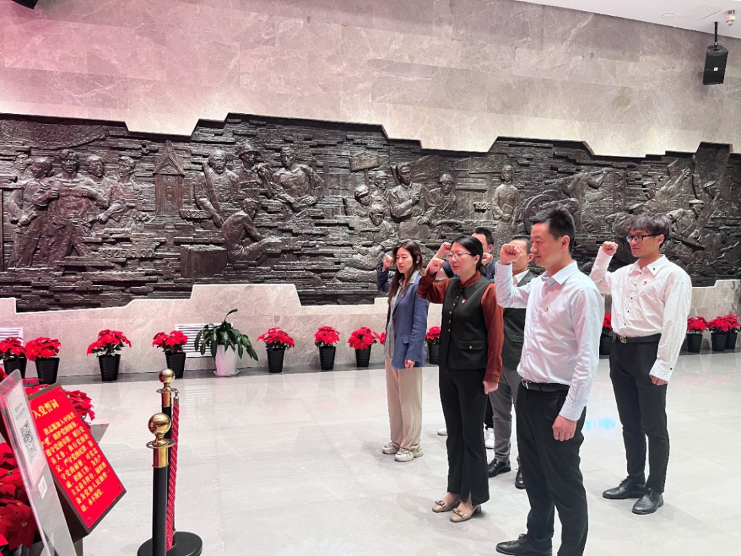 在纪念馆宣誓大厅内,支部书记李刚带领大家重温入党誓词,回顾入党时的庄严承诺和坚定决心。
