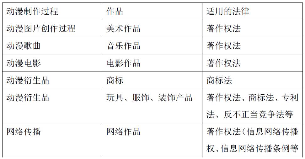下图是动漫制作过程的不同阶段及不同产品知识产权保护适用的法律: