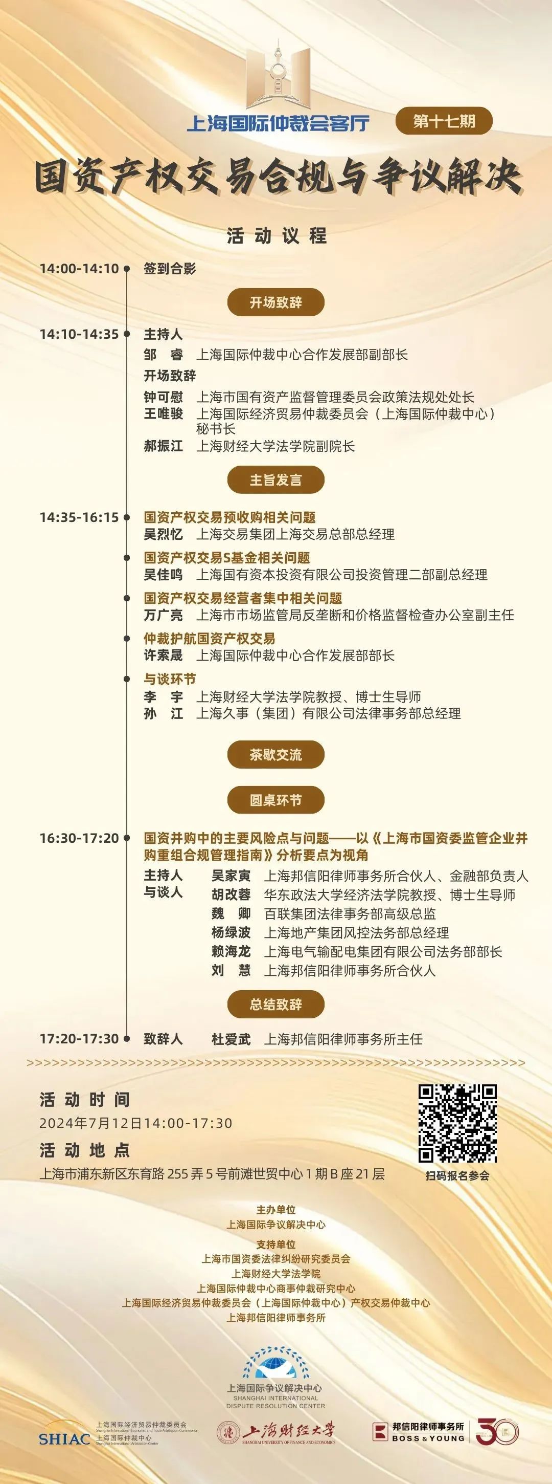由上海国际争议解决中心主办,上海市国资委法律纠纷研究委员会、上海财经大学法学院、上海国际仲裁中心商事仲裁研究中心、上海国际经济贸易仲裁委员会(上海国际仲裁中心)产权交易仲裁中心、上海邦信阳律师事务所作为支持单位的第十七期上海国际仲裁会客厅“国资产权交易合规与争议解决”将于2024年7月12日(周五)在前滩上海国际争议解决中心举办。