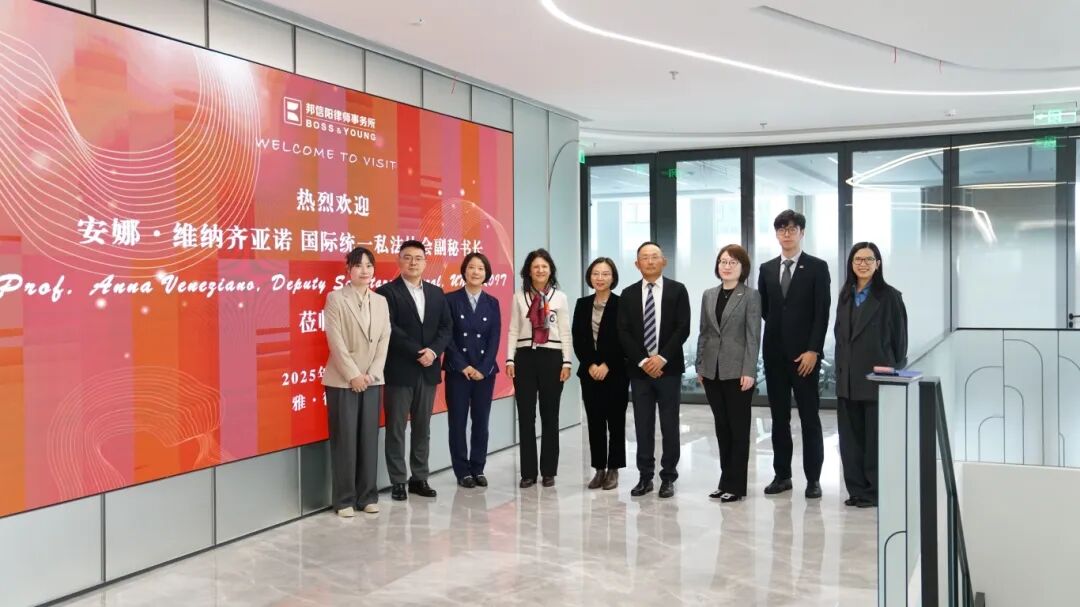 2025年11月4日上午,国际统一私法协会(UNIDROIT)副秘书长Prof. Anna VENEZIANO,国际统一私法协会首席法律官、亚洲跨国法中心联合主任、中南财经政法大学罗马一大法与经济学院院长黄美玲教授,以及上海国际仲裁中心秘书长杨光、合作发展部部员许尧晟一行到访上海邦信阳律师事务所(以下简称“邦信阳”)。邦信阳主任杜爱武律师,以及合伙人黄艳律师、合伙人陈斌寅律师、合伙人李骞律师、沈佳钰律师等共同接待并参与交流。
