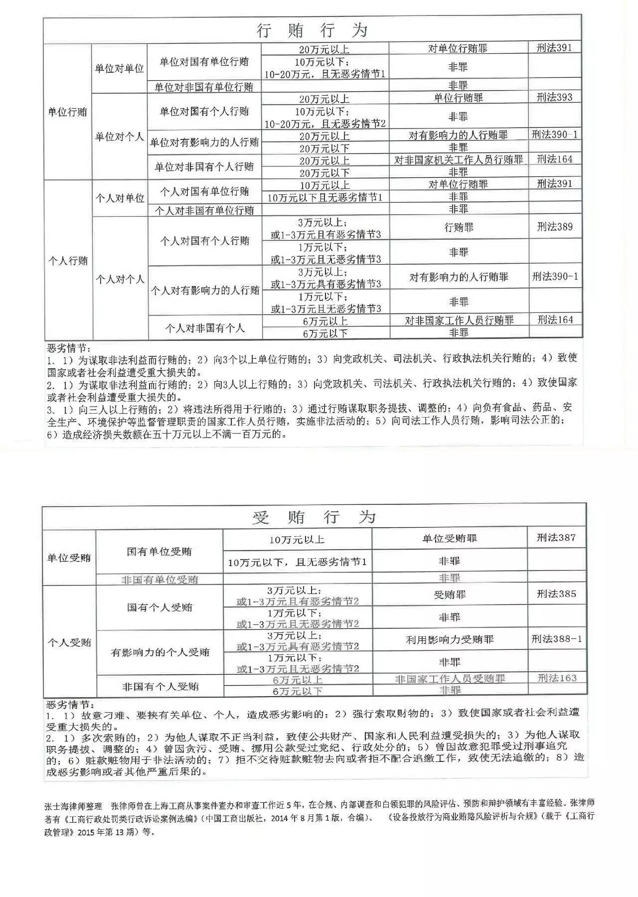 附件:商业贿赂刑事追诉标准一览表(如需要英文版,请查阅本平台于2016年5月4日推送的《最新商业贿赂刑事追诉标准》一文。