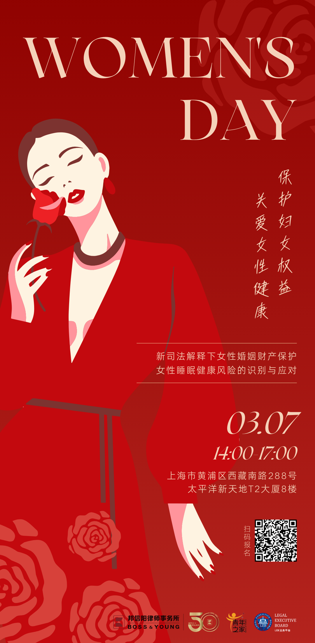 值此三八妇女节到来之际,上海邦信阳律师事务所特举办妇女节特别活动,上海邦信阳律师事务所合伙人程群爱律师将在现场分享新司法解释下女性婚姻财产保护。此外活动还特别邀请到上海市健康科技协会睡眠健康专业委员会常务委员兼秘书长张永忠,分享女性睡眠健康风险的识别与应对。