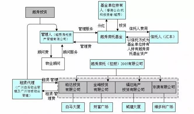2005年12月21日,越秀REITs(HK405)在香港上市,越秀投资将其旗下的4个盈利能力和发展潜力最强的优质资产白马大厦、财富广场、城建大厦和维多利亚广场打包注入REITs。越秀集团之所以能够顺利上市主要是得益于其本身固有的一些条件,即在发行REITs之前越秀投资就已经是一家在香港注册的上市公司,同时持有内地资产,其监管和法规障碍事实上已经不多。