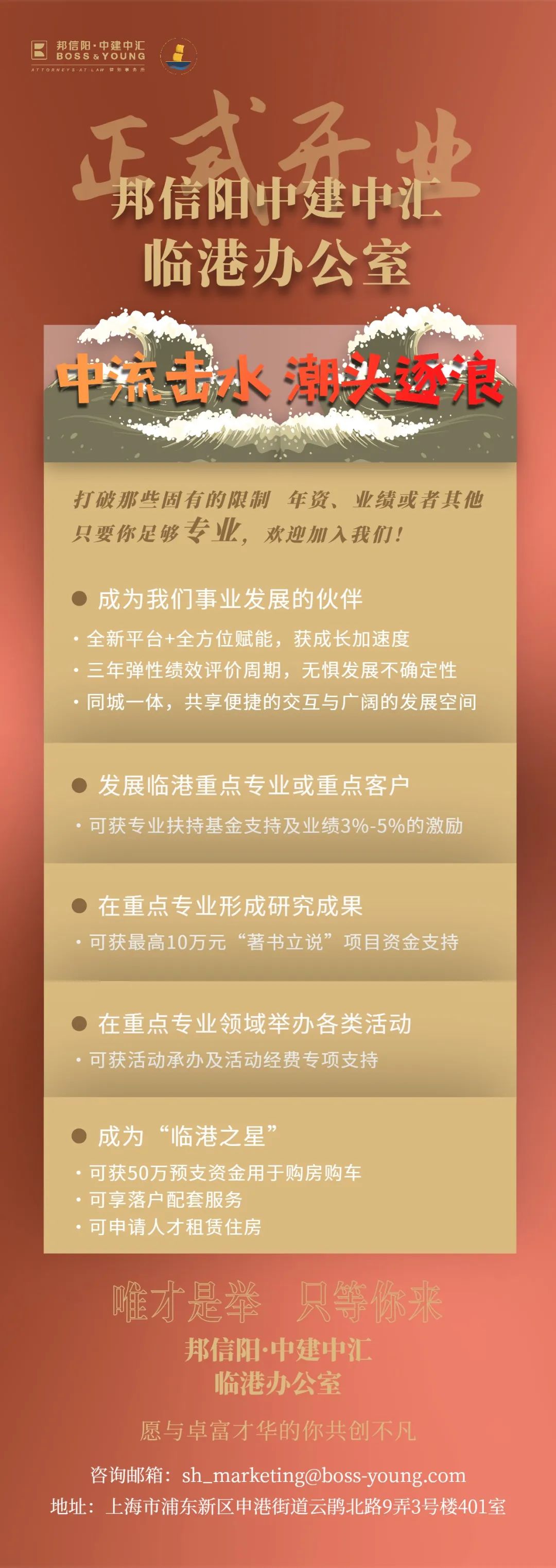 也是在这一年,邦信阳中建中汇临港办公室设立,成为上海市最早的13家获批设立临港新片区的分所之一。邦信阳中建中汇临港办公室秉承总所“专业、高效、富有创造力”的法律服务理念,以全新的面貌和姿态,与青年人共同开创一片天地。