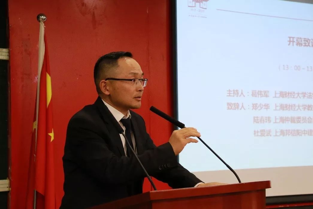 上海财经大学校长助理郑少华教授、上海仲裁委员会副秘书长陆春玮、上海邦信阳中建中汇律师事务所管理合伙人杜爱武律师进行了开幕致辞,分别阐述了本次研讨会的重要性和必要性、表达了对本次研讨会内容及顺利开展的美好期望。
