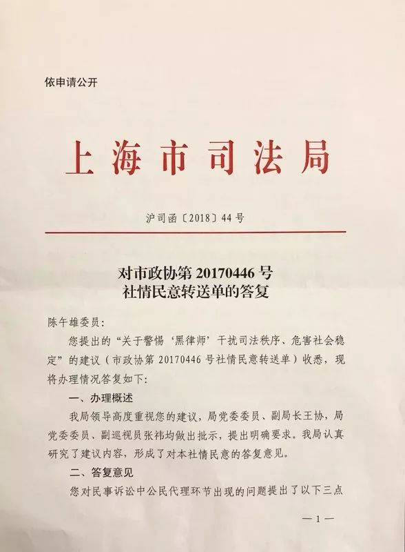 近日,本所合伙人陈午雄律师反映的“关于警惕‘黑律师’干扰司法秩序、危害社会稳定”的社情民意信息,由市委政法委书记陈寅批示,经市政协采用并转送,市高院、市司法局、市律协共同办理。2018年4月18日,上海市司法局对此进行答复并给出答复意见。