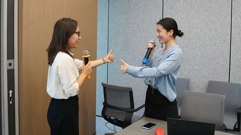 梁婧老师强调“非语言表达占整体形象的55%”,并通过现场互动不断强化学员对形象细节的感知与掌控能力。梁老师通过现场示范与全员实操,系统讲解了职业场合中的仪态管理,包括站姿、手势、眼神、鞠躬、持话筒等专业动作。学员们纷纷上台演练,梁老师逐一指导纠正,从丁字步到权力三角形手势,从话筒持握角度到舞台走位,每一个细节都体现了专业表达的背后功夫。