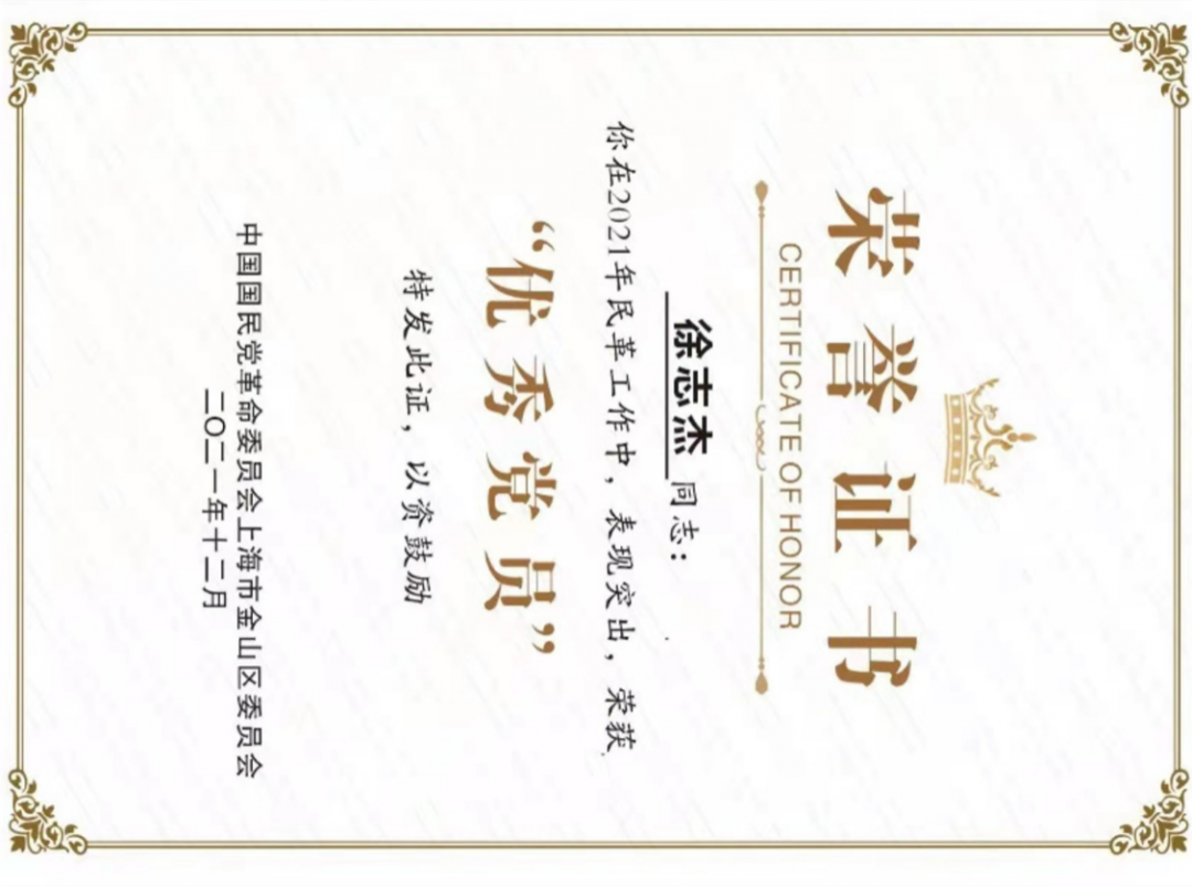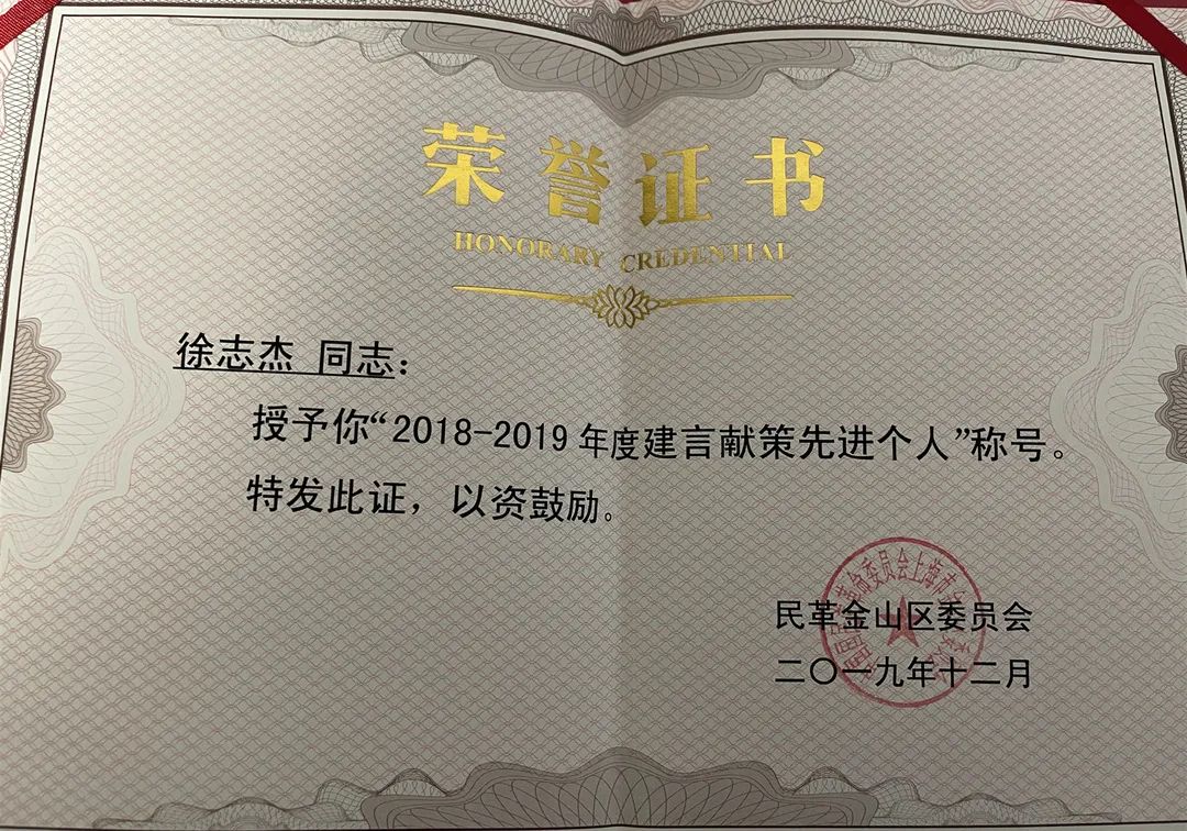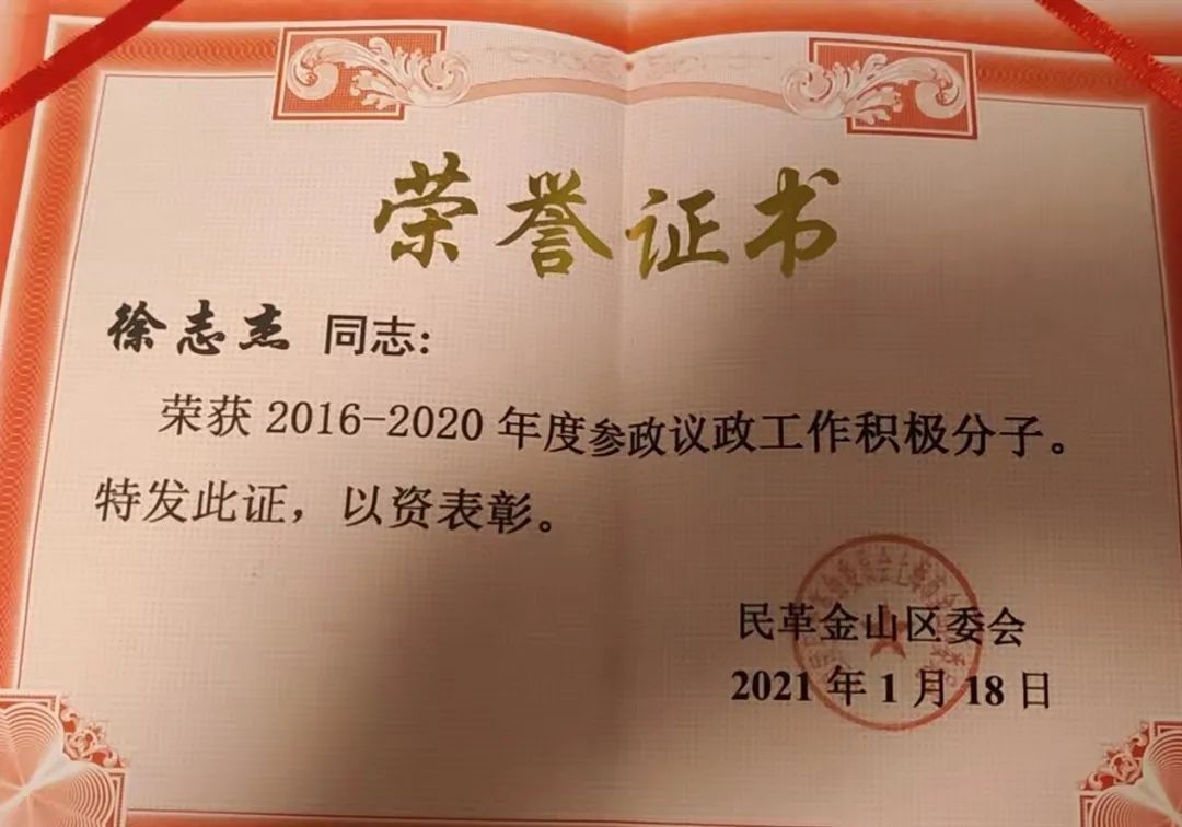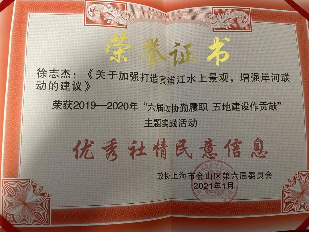 徐志杰律师,作为一名民革成员,他结合党派和本职工作特色,立足本职,从心出发,持续并热情地投入到参政议政、建言献策的工作当中,总在第一时间,把所看到的、所想到的,快速转化出来,形成建议。多年来,他及时上报了多篇社情民意信息,他所撰写的社情民意多次被报送到全国政协、市委统战部或得到市有关领导的批示,因此被民革金山区委员会评为“2018-2019年度建言献策先进个人”“2016-2020年度参政议政工作积极分子”。律所办公地点在黄浦江边,徐志杰律师形成的《关于加强打造黄浦水上景观,增强岸河联动的建议》有来自于“第一线”的亲身感受、感悟,得到市有关领导批示,并被政协上海市金山区第六届委员会评为优秀社情民意信息。