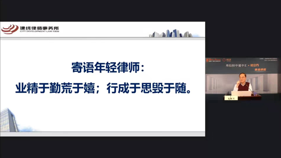 本期课程由邦信阳中建中汇主任杜爱武律师、业务促进中心负责人陆国飞律师主持,邀请建纬所朱树英律师主讲,主要聚焦以下几点: