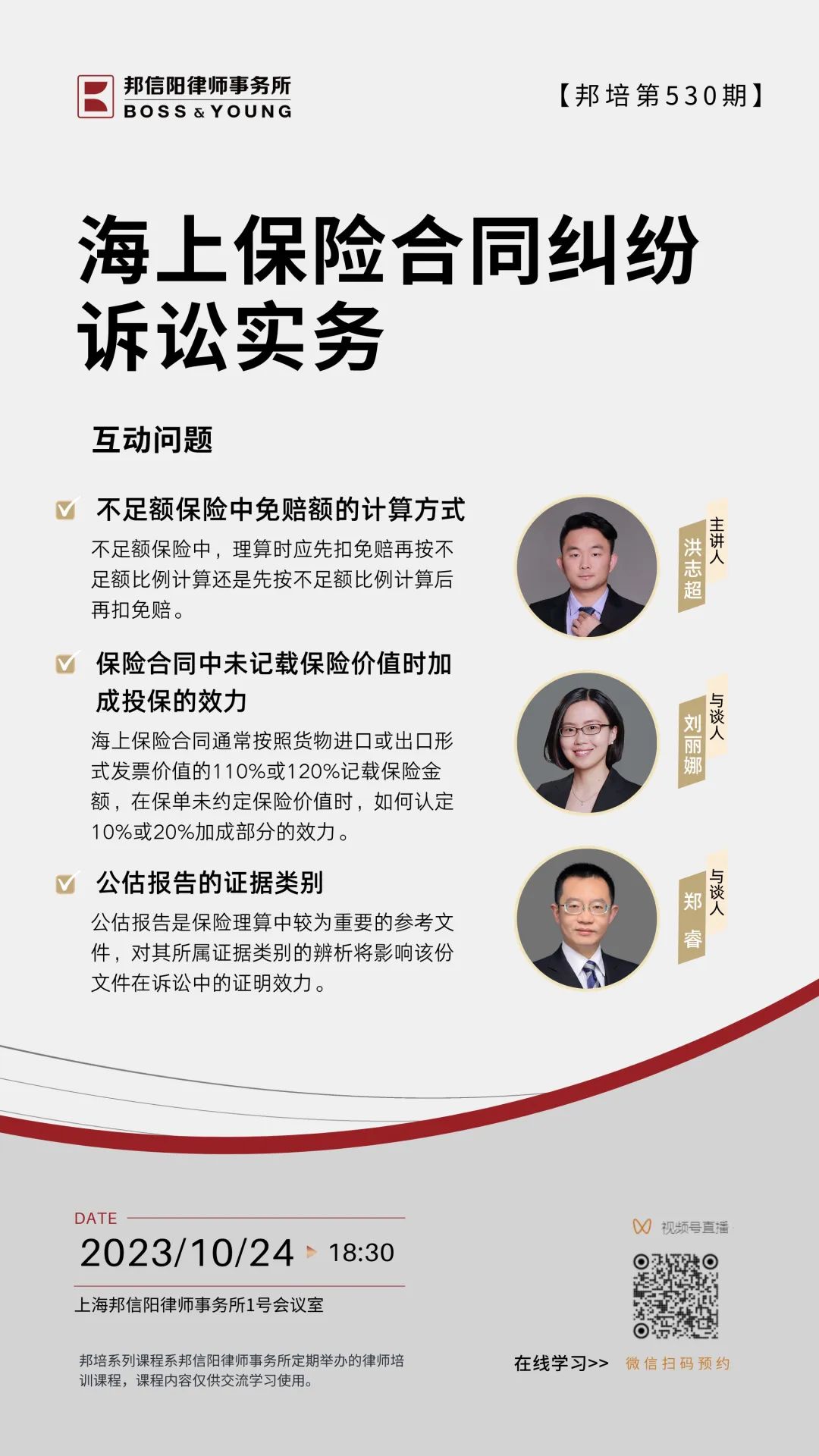 2023年10月24日,上海邦信阳律师事务所“邦培第530期”,由合伙人洪志超律师主讲、合伙人刘丽娜律师、上海海事大学法学院副教授郑睿与谈,主题为“海上保险合同纠纷诉讼实务”。本次课程内容由殷凤超律师整理。