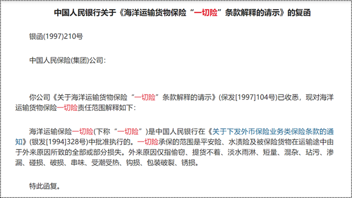 《中国人民银行关于《海洋运输货物保险“一切险”条款解释的请示》的复函》(已废止)