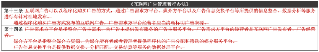 《办法》删除了《暂行办法》第十三条、第十四条关于程序化购买的相关规定,不再使用“广告需求方平台经营者”“媒介方平台经营者”“广告信息交换平台”的概念。国家市场监督管理总局曾于2021年11月26日就《暂行办法》的修订公开征求意见,在市监总局发布的《关于<互联网广告管理暂行办法>的修订说明》中对这一删改进行了说明:“程序化购买属于互联网广告行业的一种经营模式,在法律层面并未新创设出一个区别于‘广告经营者’的市场主体,对广告内容没有本质影响,且现行《暂行办法》相关程序化购买规定导致互联网平台责任过轻,不利于规范互联网平台的广告活动。”删除程序化购买的相关规定,不再对广告经营者具体作用进行区分,化繁为简,能够很好地避免因主体身份认定不清带来的法律适用问题,回归《广告法》关于广告、广告经营者的本质定义,是本次修订的一大进步。