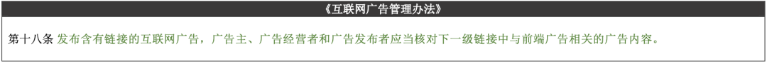 “核对广告内容”要求对广告内容的真实性、合法性进行核对,广告发布者的核对可以采用将广告内容与有关证明文件对照等办法进行核对,而广告主对广告内容真实性的知悉、把握程度通常高于广告发布者,其对于真实性、合法性的保证义务也会相对更重。不论是前端广告的发布还是链接的跳转、抑或是跳转后内容的呈现,都可能涉及多个广告经营主体或者是媒体平台。对于品牌方而言,如何管理下游广告服务商、与平台沟通,确保下一级链接内容的合法性、不被篡改,或者是发现违法情形时的及时处置,可能会是一个在实操层面的合规难题。