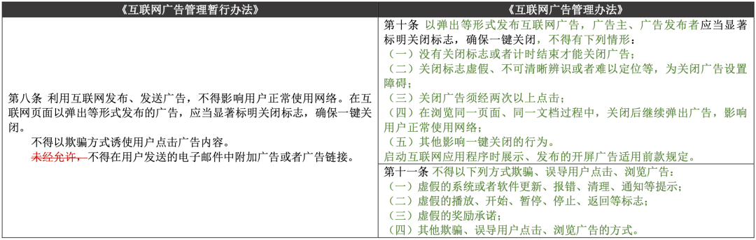 在《暂行办法》下,仅明确了弹出广告应满足“显著标明关闭标志,确保一键关闭”的要求,《办法》在保留弹出广告的基础上新增了开屏广告,要求开屏广告同样须满足该要求。同时,《办法》第十条、第十一条新增了影响一键关闭、欺骗误导用户点击浏览广告的细化规定,对于企业合规和监管执法而言都能给予更加明确的指引。