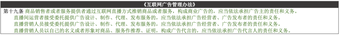 《办法》第十九条重申了利用互联网直播发布广告的相关主体责任,“直播间运营者”和“直播营销人员”的定义在2021年5月25日实施的《网络直播营销管理办法》中已有明确规定[iii],《办法》并未设定新的法律义务,其关于主体责任的规定与《网络直播营销管理办法》第十九条“直播间运营者、直播营销人员发布的直播内容构成商业广告的,应当履行广告发布者、广告经营者或者广告代言人的责任和义务。”之规定相一致。实践层面对于该款规定的适用最终可能还是落脚在广告界定的问题上,例如以直播形式发布《消费者权益保护法》第八条、《产品质量法》第二十七条、《食品安全法》第六十七条等法律法规强制要求提供的产品相关信息,是否不应认定为广告?既然不认定为广告,是否也无须经过广审?这些问题仍值得进一步探讨。