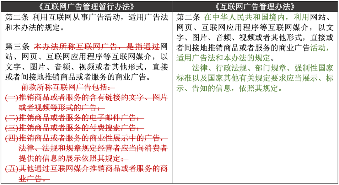 互联网广告在广告形式、经营模式、投放方式等方面的变化日新月异,以列举的形式解释互联网广告的外延可能已经无法适应当前互联网广告监管新形势的要求,故《办法》删除了《暂行办法》中关于互联网广告外延的细化规定。同时,《办法》根据上位法《广告法》对于广告的定义补充了“在中华人民共和国境内”这一适用条件,使互联网广告的定义与上位法能够保持一致。