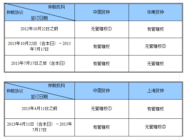 此外需要指出的是,华南贸仲和上海贸仲分别在其2012版仲裁规则及2015版规则中规定,将仲裁协议中约定仲裁机构为“中国贸仲华南分会”及“中国贸仲上海分会”的案件纳入其管辖的范围,该约定与最高法批复有所抵触,应考虑在今后颁布的仲裁规则中予以修改。
