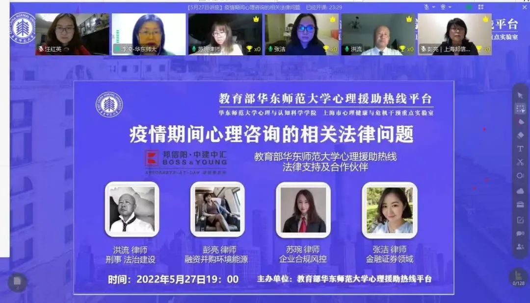 2022年5月27日晚,邦信阳中建中汇洪流律师、苏琬律师、张洁律师和彭亮律师作为教育部华东师大心理援助热线的法律支持成员及合作伙伴,为华东师大心理援助热线工作组千余名成员开展了主题为“疫情期间心理咨询的相关法律问题”的线上法律讲座,并针对相关实践中遇到的问题进行详尽解答。