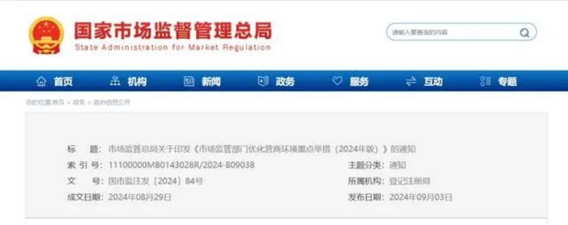 2024年9月3日,市场监管总局印发《市场监管部门优化营商环境重点举措(2024年版)》(国市监注发〔2024〕84号)。从完善制度规则、营造便利规范的经营主体准入退出环境、维护公平有序的市场竞争环境、规范市场秩序、严格规范公正文明执法、强化质量支撑和标准引领、筑牢安全底线、提升营商环境国际化水平、优化政务服务等九个方面作出具体部署。