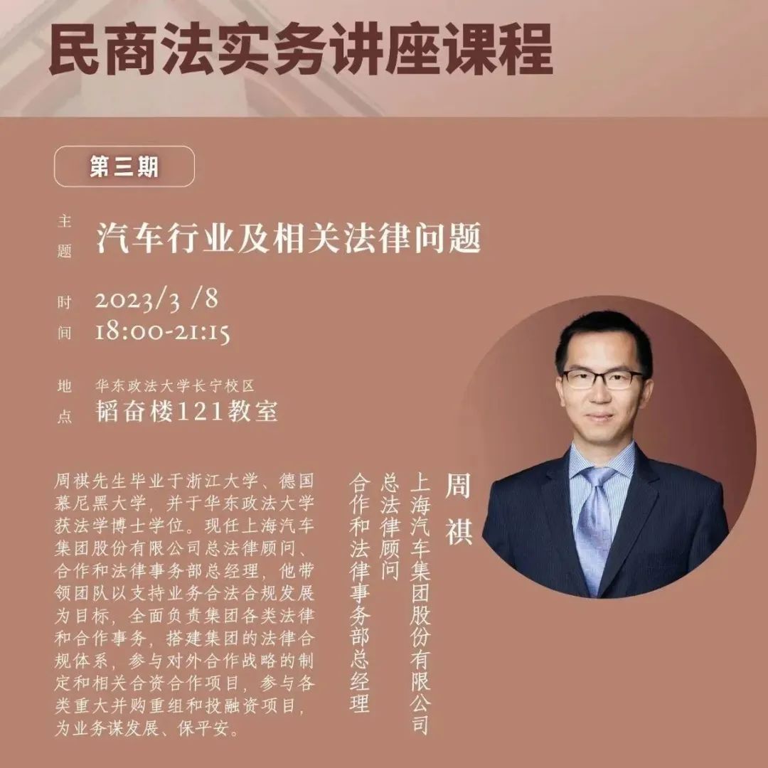 第三期课程由上海汽车集团股份有限公司总法律顾问、合作和法律事务部总经理周祺先生主讲。