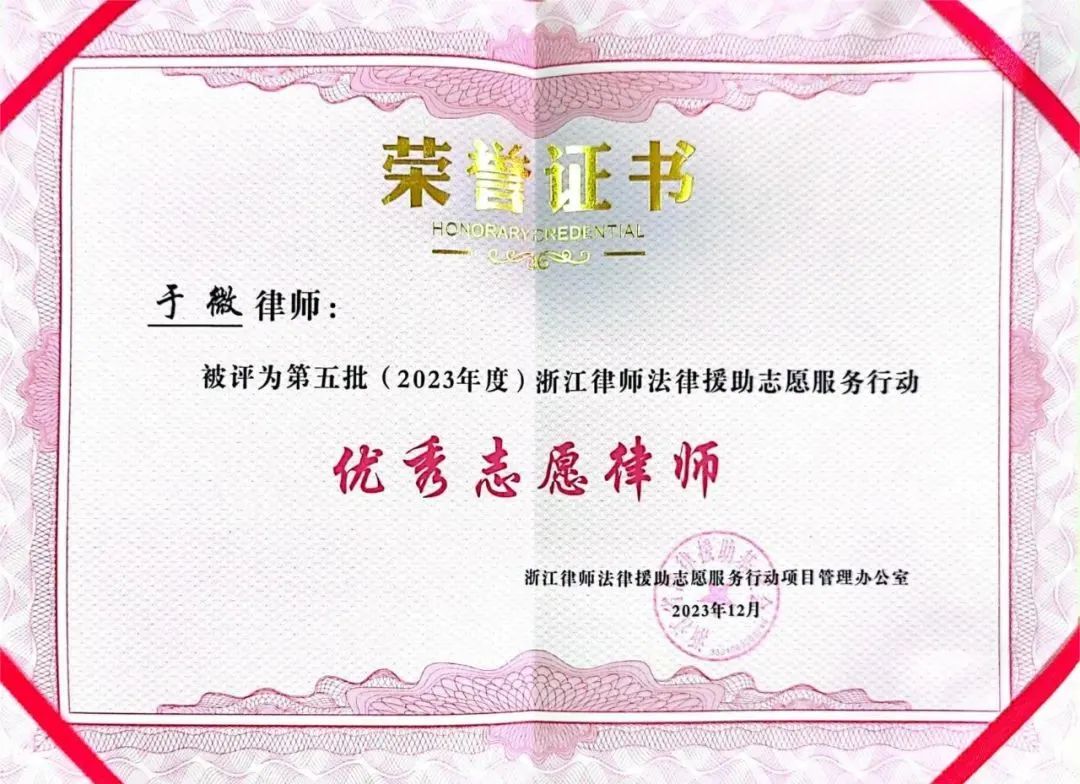 于微,杭州市律协第十届公益和社会责任委员会委员,浙江省高级人民法院民事再审案件调解员,杭州互联网法院调解员,杭州平安企业联盟反诈宣讲团金牌讲师,浙江省律师跑团成员。于律师于2022年、2023年连续两年在浙江省基层从事法律援助志愿服务活动,并获第四批(2022年度)“优秀志愿律师”和第五批(2023年度)“优秀志愿律师”荣誉称号。