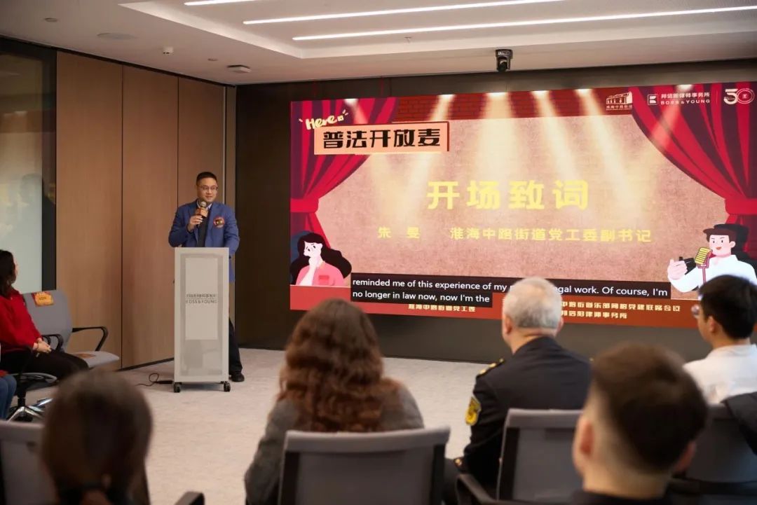 黄浦区区司法局副局长张唐俊表示,第一期“普法开放麦”选择“涉外法律服务”主题,主要是为了进一步贴合国家、市区对法律服务业发展的政策导向和民营经济的发展大势。淮海中路街道外向型经济和楼宇经济发达,民营企业和外资企业集聚,法律服务业集聚效应显著,“一园三区”的战略定位与法律服务业融入区域发展高度契合,“普法开放麦”作为区域化党建项目,一是能促进律所与区域内企业双向奔赴,有效赋能“淮海新天地进口示范区”商业繁茂;二是能促进区司法局、律工委与企业的双向交流,更好地挖掘和梳理企业需求,通过“开放麦”这类轻松的交流平台激发共同发展的创造力;三是实现青年律师与企业青年白领的双向赋能,鼓励青年人才在初创阶段携手同行、共同成长。