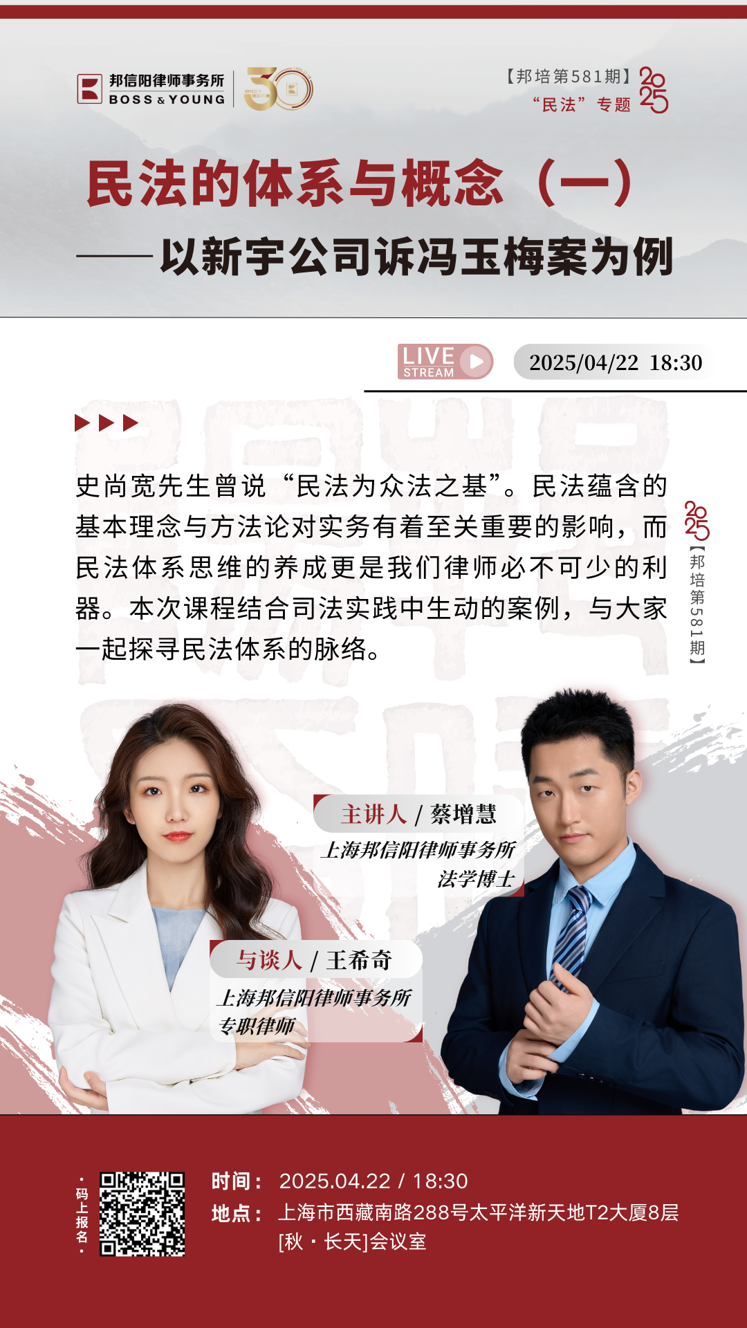 本期课程将由上海邦信阳律师事务所法学博士蔡增慧主讲,由上海邦信阳律师事务所专职律师王希奇与谈。