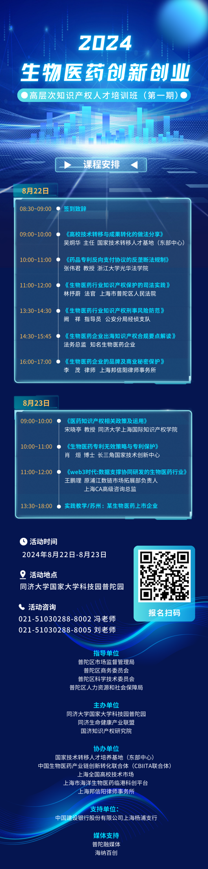 为提升生物医药领域创新创业人员的知识产权意识和能力,培养高层次知识产权人才,加快发展生物医药行业新质生产力,同济大学国家大学科技园普陀园、同济生命健康产业联盟和国济知识产权研究院共同主办2024生物医药创新创业高层次知识产权人才培训班。邦信阳作为协办单位参与此次活动,邦信阳知识产权部李茂律师受邀作为培训班讲师,分享《生物医药企业的品牌及商业秘密保护》。