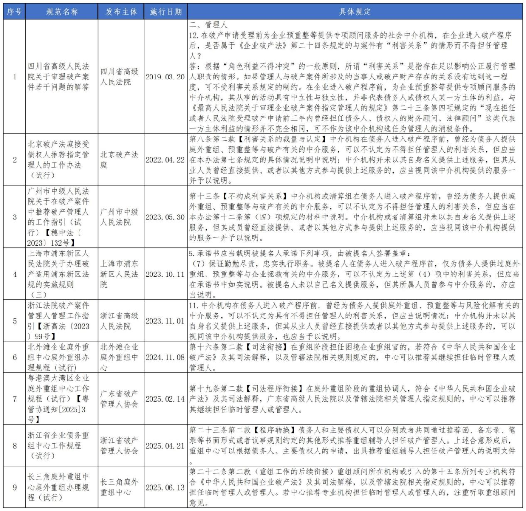 全国范围内已有部分法院通过发布指引、解答等规范性文件的方式,明确:在债务人进入破产程序前,为债务人企业提供庭外重组等与破产、风险化解有关的中介服务,可以不认定为担任管理人的利害关系。另外,目前成立的企业庭外重组平台,基本也在其工作规程中明确规定:在庭外重组阶段担任重组辅导机构的,只要符合《企业破产法》及其司法解释的规定,该中介机构可继续担任破产管理人,并且重组平台还可推荐其担任临时管理人或管理人。
