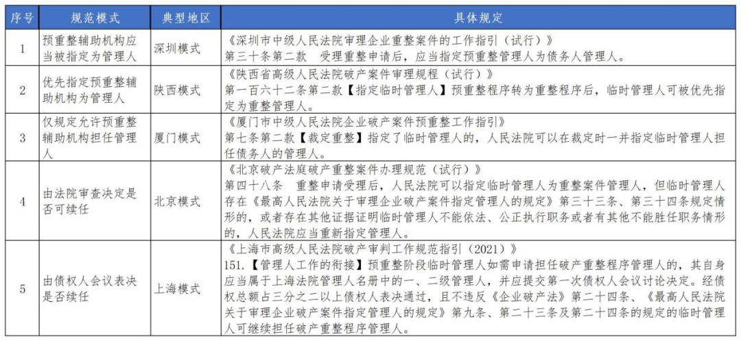 遍察全国各地预重整指引或规程,对预重整辅助机构(各地称预重整管理人或临时管理人等)与管理人的衔接大致可归纳为如下几种规范模式:一是预重整辅助机构应当被指定为管理人,典型如深圳模式;二是优先指定预重整辅助机构为管理人,典型如陕西模式;三是仅规定允许预重整辅助机构担任管理人,典型如厦门模式;四是由法院审查决定是否可续任,典型如北京模式;五是由债权人会议表决是否续任,典型如上海模式。另有地区尚无公开的预重整指引或规程,或者规范中未对此作出规定。对于担任预重整辅助机构是否构成担任管理人的利害关系,无论采取以上何种模式,似乎都可得出不构成利害关系的结论。
