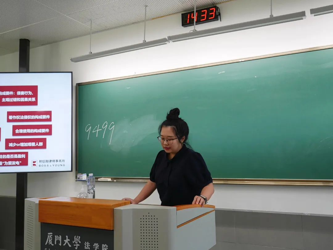 2024年7月9日-10日,邦信阳厦门办公室执行主任陈震律师、娱乐与文化产业部骨干吴雪钰律师应厦门大学法学院的邀请,为厦门大学法学院学生讲授影视法律实务专题课程之《影视行业的侵权与维权》。