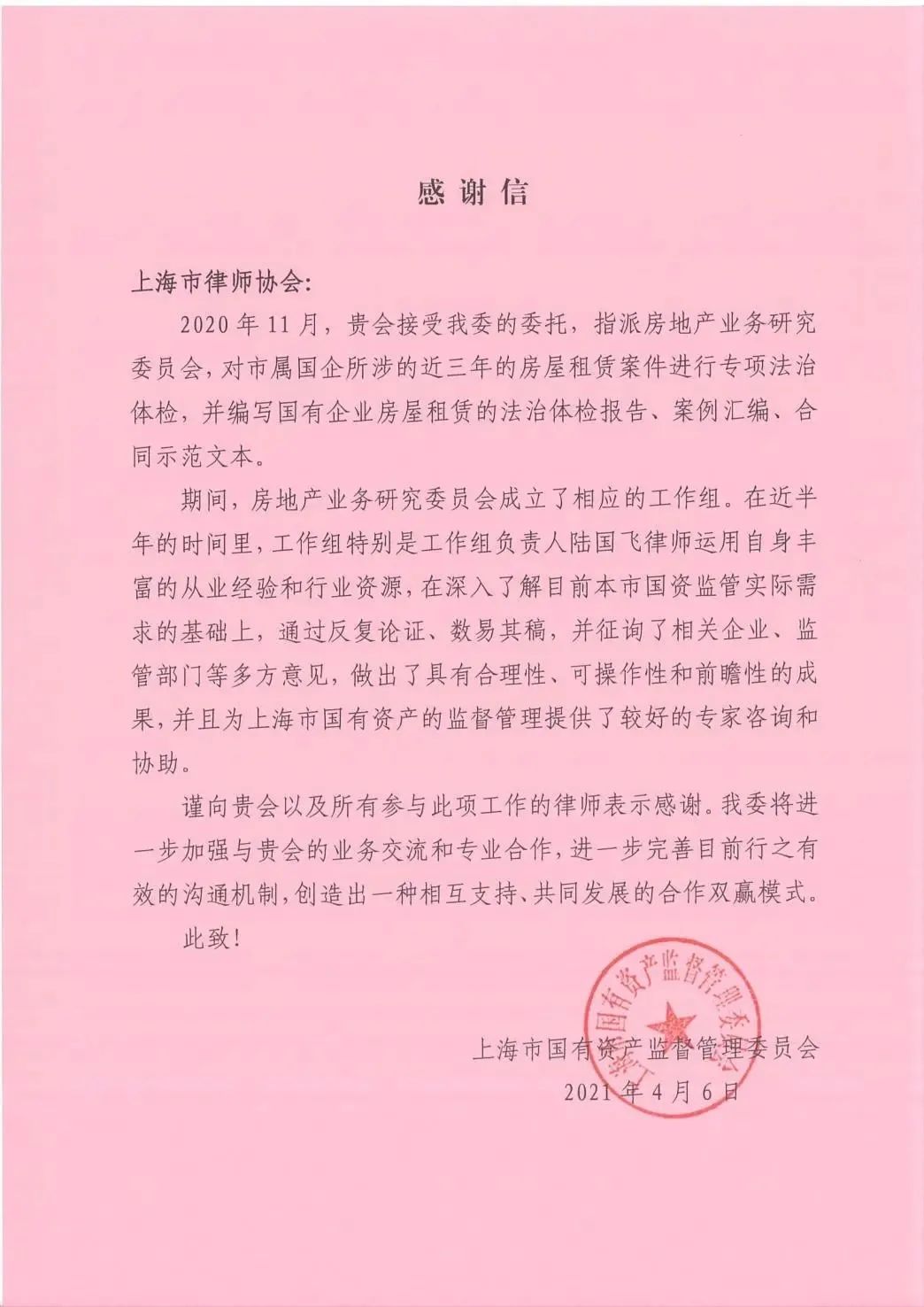 上海邦信阳中建中汇律师事务所房地产与建设工程专业领军人陆国飞律师带领上海律协房地产业务研究委员会,承担上海市属国企房屋租赁案件法治体检工作,喜获好评。