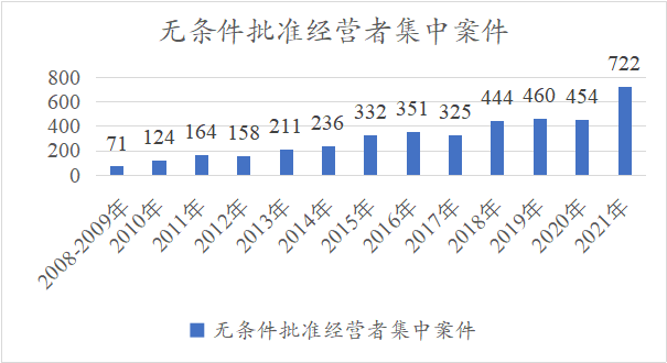 反垄断法实施以来,经营者集中案件总体呈现逐年递增的态势。其中,无条件批准经营者集中案件,从一开始的两位数增长到如今的三位数,2021年无条件批准经营者集中案件增至722件;自反垄断法实行至今,附条件批准案件共有56件,禁止经营者集中案件则有3件,分别为:可口可乐收购汇源果汁案,马士基、地中海航运和达飞设立网络中心案,以及虎牙公司与斗鱼国际控股有限公司合并案。