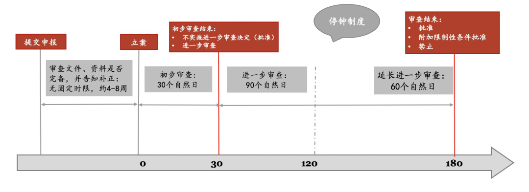 值得注意的是,2022年修改后的《反垄断法》引入了“停钟”制度,规定在三种情形下,经营者集中的审查期限可以中止计算,具体情形分别为:“(一)经营者未按照规定提交文件、资料,导致审查工作无法进行;(二)出现对经营者集中审查具有重大影响的新情况、新事实,不经核实将导致审查工作无法进行;(三)需要对经营者集中附加的限制性条件进一步评估,且经营者提出中止请求。”