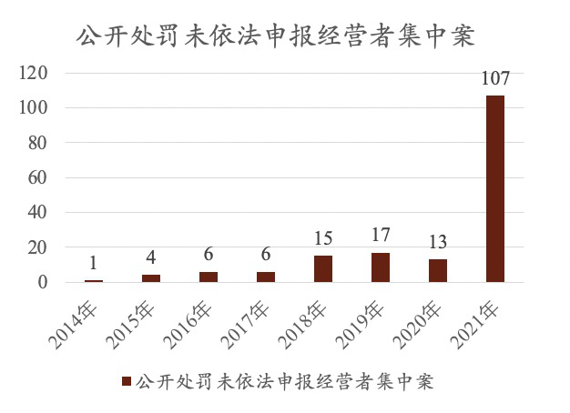 此外,近年来未依法申报违法实施集中的公开处罚案件数量也在不断增加。就2021年而言,国家市场监督管理总局公开了107起违法实施集中的案件,案件数量和处罚金额均创历史新高,彰显了国家强化反垄断和防止资本无序扩张的坚定决心。